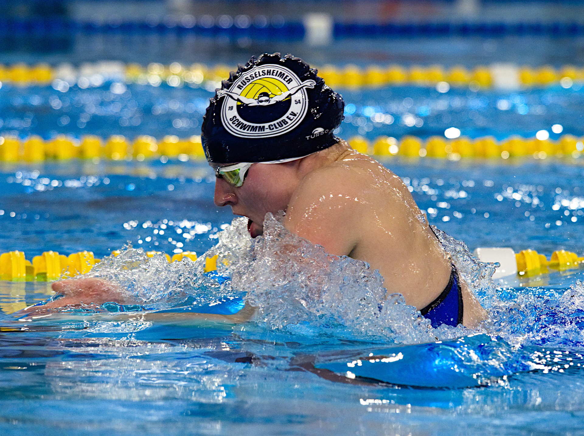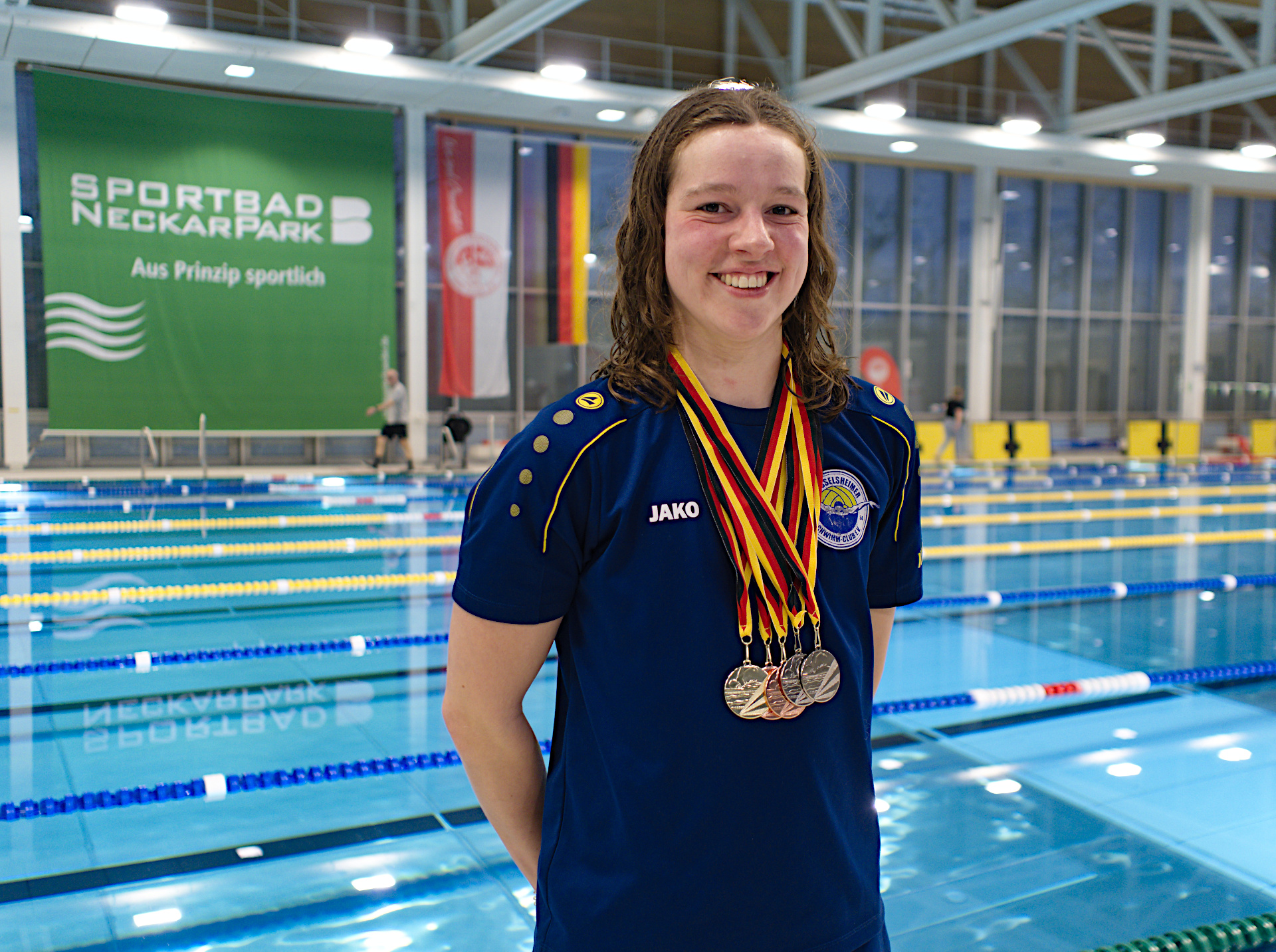 Katharina Ganz ging fünf Mal für den Rüsselsheimer Schwimm-Club an den Start und stand fünf Mal auf dem Siegerpodest. Ihre fünfte Strecke war 50 Meter Brust, über die sie Erste und damit Offene Süddeutsche Meisterin wurde. Katharina freute sich bei der späteren Siegerehrung sehr über Medaille und Titel.