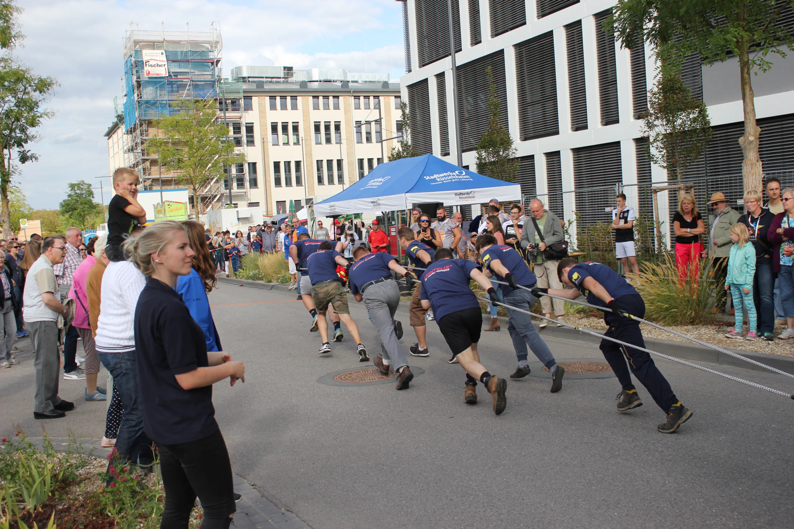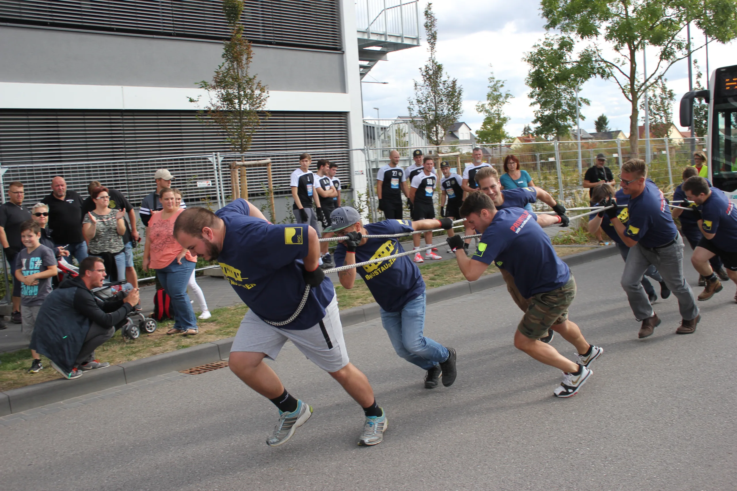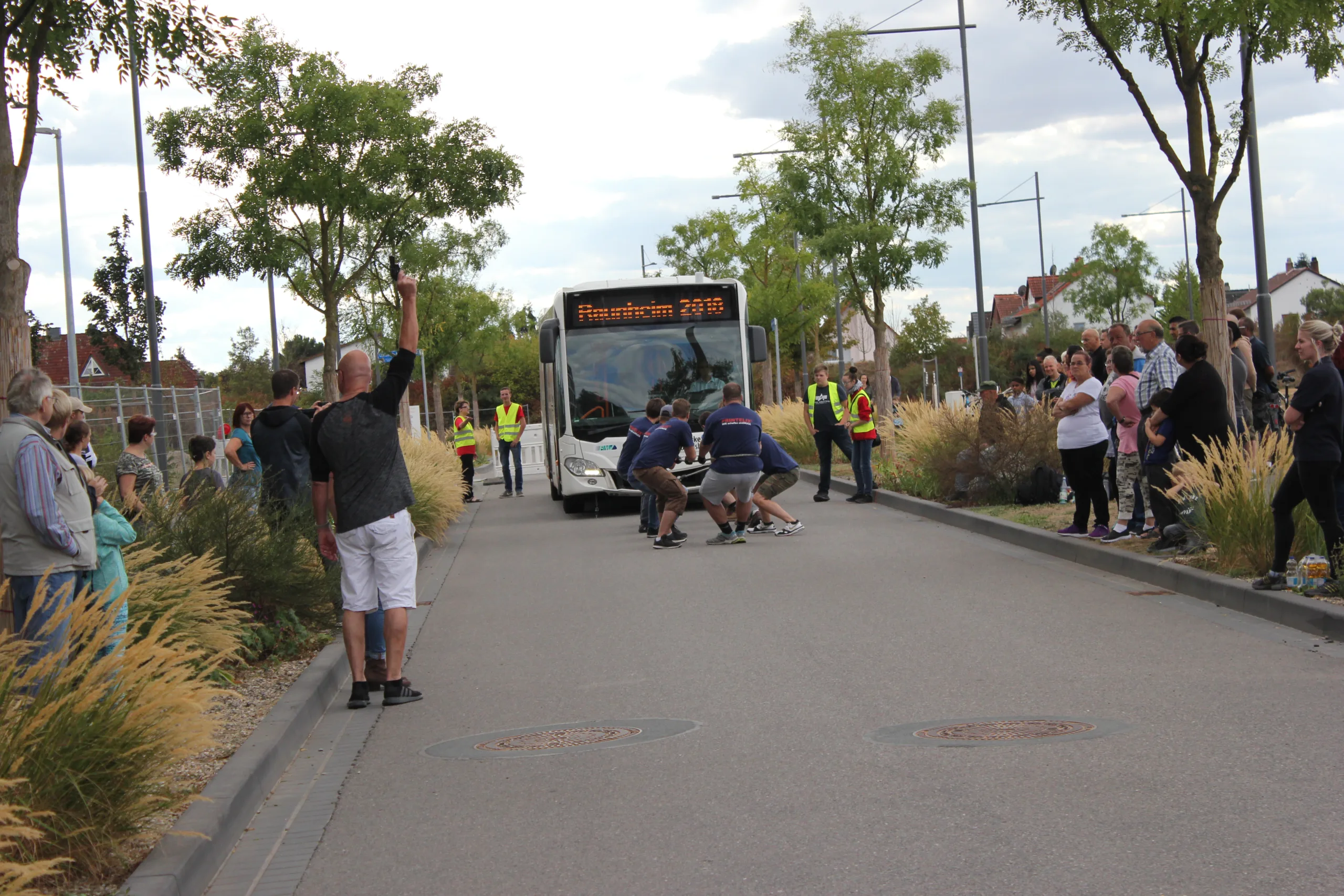 Beim Bustauziehen geht es darum, mit acht Personen einen 12 Tonnen schweren und 12,5 Meter langen Linienbus der Stadtwerke über eine Strecke von 37,5 Meter zu ziehen. Dabei wird dann der Schnellere aus zwei Durchgängen gewertet. Die aktuelle Rekordzeit von vor zwei Jahren hat das Team Masse auf der Kerb in Bischofsheim mit 18,37 Sekunden aufgestellt. Diese sollte aber nicht mehr lange Bestand haben.