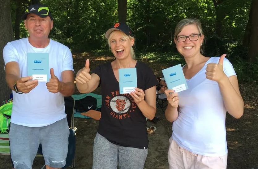 Spannend war die Veranstaltung auch für drei weitere Anwesende. Und zwar für Nina Ellermann, Anke Bravin-Oceguera und Manfred Köbeler, die in Darmstadt ihre letzte Prüfung zum Wettkampfrichter ablegen „durften“. So wurden fleißig Wettkampfformulare ausgefüllt, Zeiten gemessen, letzte Fragen gestellt und in der Sonne geschwitzt, bis man endlich die ersehnte Bescheinigung, nebst Kampfrichter-Shirt und Trillerpfeife in den Händen halten konnte.